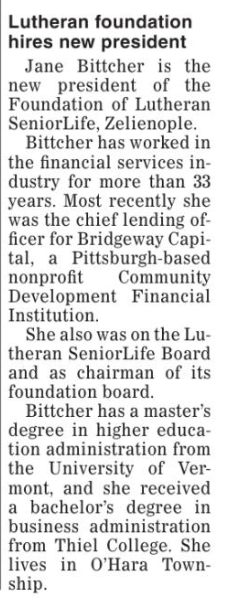 A Mission Advanced: Celebrating Jane Bittcher’s Decade of Leadership as the Lutheran SeniorLife Foundation President Posted on November 24, 2025 “Gratitude is the foundation upon which great achievements are built,” once said Jane Bittcher, a principle she has exemplified throughout her decade of leadership as President of the Lutheran SeniorLife Foundation. As she retires on December 19, Bittcher has impacted countless lives through her fundraising efforts, which directly contributed to moments of care, connection, and hope across Western Pennsylvania. Lutheran SeniorLife reflects on a tenure defined by vision, generosity, and an enduring commitment to transforming lives. For Bittcher, Lutheran SeniorLife has never been “just a workplace.” It has been a community she cherished, a mission she championed, and a calling that shaped her daily work. Throughout her tenure, she has been a tireless advocate for older adults, a trusted partner to colleagues, and a steward of generosity who elevated the Foundation’s reach and impact. Her ability to build deep and meaningful relationships with donors, partners, team members, and families has been central to the Foundation’s growth and success while strengthening Lutheran SeniorLife’s presence across Western Pennsylvania. Under her leadership, the Foundation expanded its support for critical services, introduced transformative programs, and secured the financial resources required to ensure that older adults can live with dignity, security, and joy. Bittcher’s steady leadership touched every corner of our organization, and her influence is visible in strengthened programs, expanded capacity, and the countless lives uplifted through her work. One of the most visible examples of her impact is the Foundation’s Annual Event, now one of Lutheran SeniorLife’s most significant traditions for inspiring generosity and mission support. It has become a catalyst for building donor partnerships and securing millions of dollars that directly support the Benevolent Care Fund, LIFE Programs, rehabilitation services, and other essential work that defines our mission. For Bittcher, this year’s Annual Event carried special meaning. “I feel a tremendous sense of gratitude and support,” she shared. “There are so many people who attend this event year after year, and I realize how much they love and appreciate the organization.” She also expressed her heartfelt appreciation for Grant Street Asset Management, the long-standing Signature Sponsor. “As family and as a partner, I have really enjoyed that relationship. Their commitment to our mission has meant so much.” Her final Annual Event as President was a fitting celebration of her decade of leadership, filled with joy, connection, and reflection on the donors whose generosity has shaped Lutheran SeniorLife’s future. Through her passion, empathy, and belief in our mission, Bittcher inspired others to give generously and consistently. Her legacy is one of vision, impact, and gratitude.As Bittcher enters her well-earned retirement, she leaves the Foundation exceptionally well-positioned for the years ahead. It is with great confidence and enthusiasm that we announce her successor. Joelleen Yerace has been appointed Vice President of Development and Fundraising. Yerace brings extensive experience in nonprofit leadership, a deep dedication to community impact, and a leadership style rooted in collaboration and integrity. She is known for her strategic approach, strong relationship-building skills, and genuine passion for service. She will continue the momentum that Bittcher helped create and advance the Foundation’s impact with clarity and purpose. In the coming weeks, Jane and Joelleen will work together to ensure a seamless and thoughtful transition. We are grateful for the leadership continuity this provides and confident in the Foundation’s future under Joelleen’s guidance. While Bittcher looks forward to the next chapter in her life, she leaves behind an enduring legacy built on compassion, excellence, and the belief that our mission transforms lives. In her own words: “Thank you for allowing me to be part of something truly special. Lutheran SeniorLife, and all of you, will forever hold a place in my heart.”